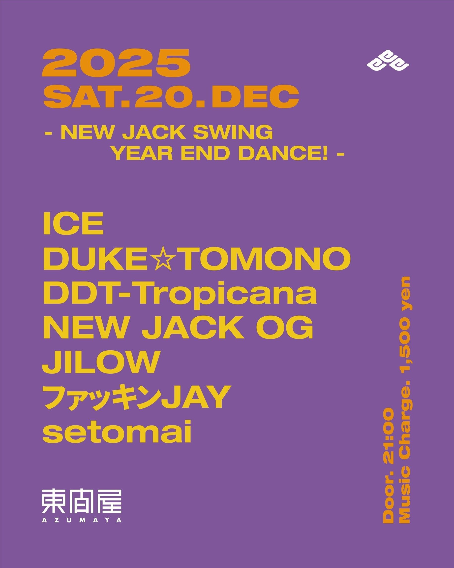 2025.12 20 DEC - NEW JACK SWING YEAR END DANCE! - FUNK HIPHOP SOUL R&B 0 Shares Facebook Twitter google Line DATE: 2025-12-20 SAT OPEN: 21:00 VENUE: PRICE: Music Charge 1,500yen LINE UP: ICE DUKE TOMONO DDT-Tropicana NEW JACK OG JILOW ファッキンJAY setomai