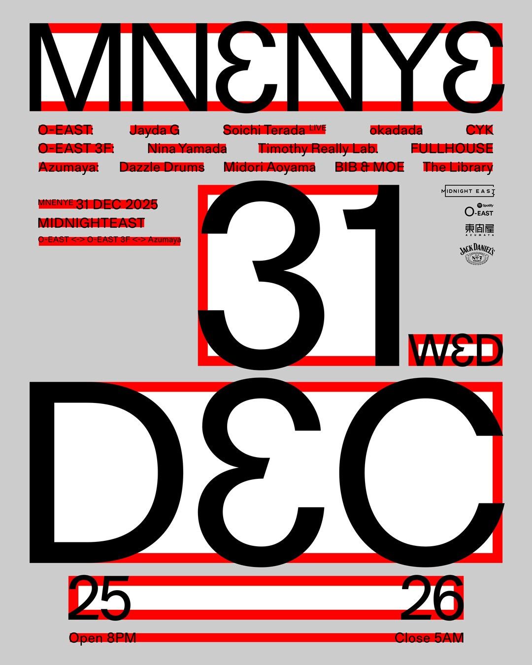 国内からは、日本ハウスミュージック界のパイオニア・Soichi Teradaが、3年連続で「MNENYE」のカウントダウンアクトを務める。さらに、今月MIDNIGHT EASTにて都内では7年ぶりとなるOpen to Lastセットを行うokadada、これまでに結成8周年イベントやLogic1000との共演などメモリアルなパーティーでMIDNIGHT EASTへ出演してきたCYKが登場する。