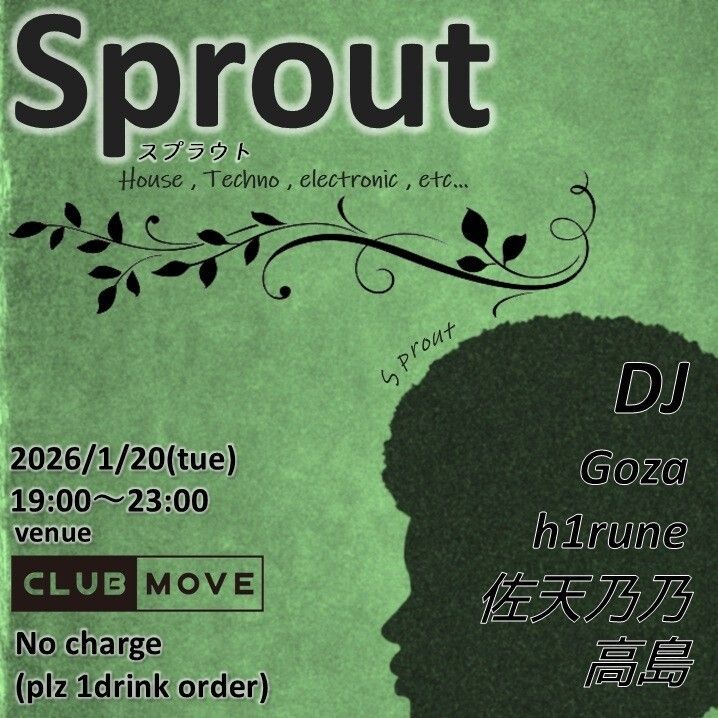 sproutは京都を中心にtechno , house , nardcore , 昭和歌謡等々をplayする高島による4つ打ちを中心とした様々なジャンルの新芽DJの芽生え、成長を促進するイベントです。 共に成長を刺激し合える仲間の出会い、新しい人材発見の場として是非ごゆるりとご利用下さい。