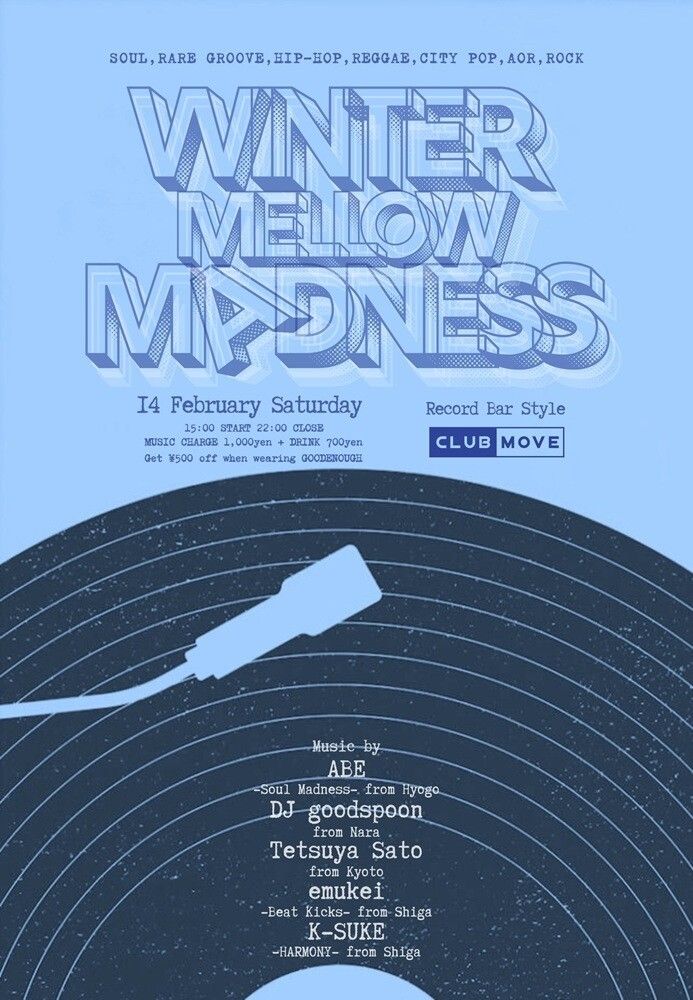 夏と秋に開催された「Summer Mellow Madness」「Autumn Mellow Madness」のウインターバージョンとなる「Winter Mellow Madness」が2/14(土)のサタデーアフタヌーンの時間帯にて開催。