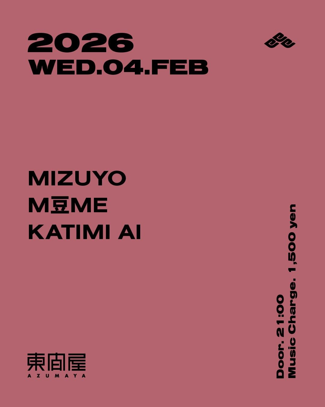 2026.02 04 FEB Azumaya -Wednesday- HOUSE 0 Shares Facebook Twitter google Line DATE: 2026-02-04 WED OPEN: 21:00 VENUE: PRICE: Music Charge 1,500yen LINE UP: MIZUYO M豆ME KATIMI AI