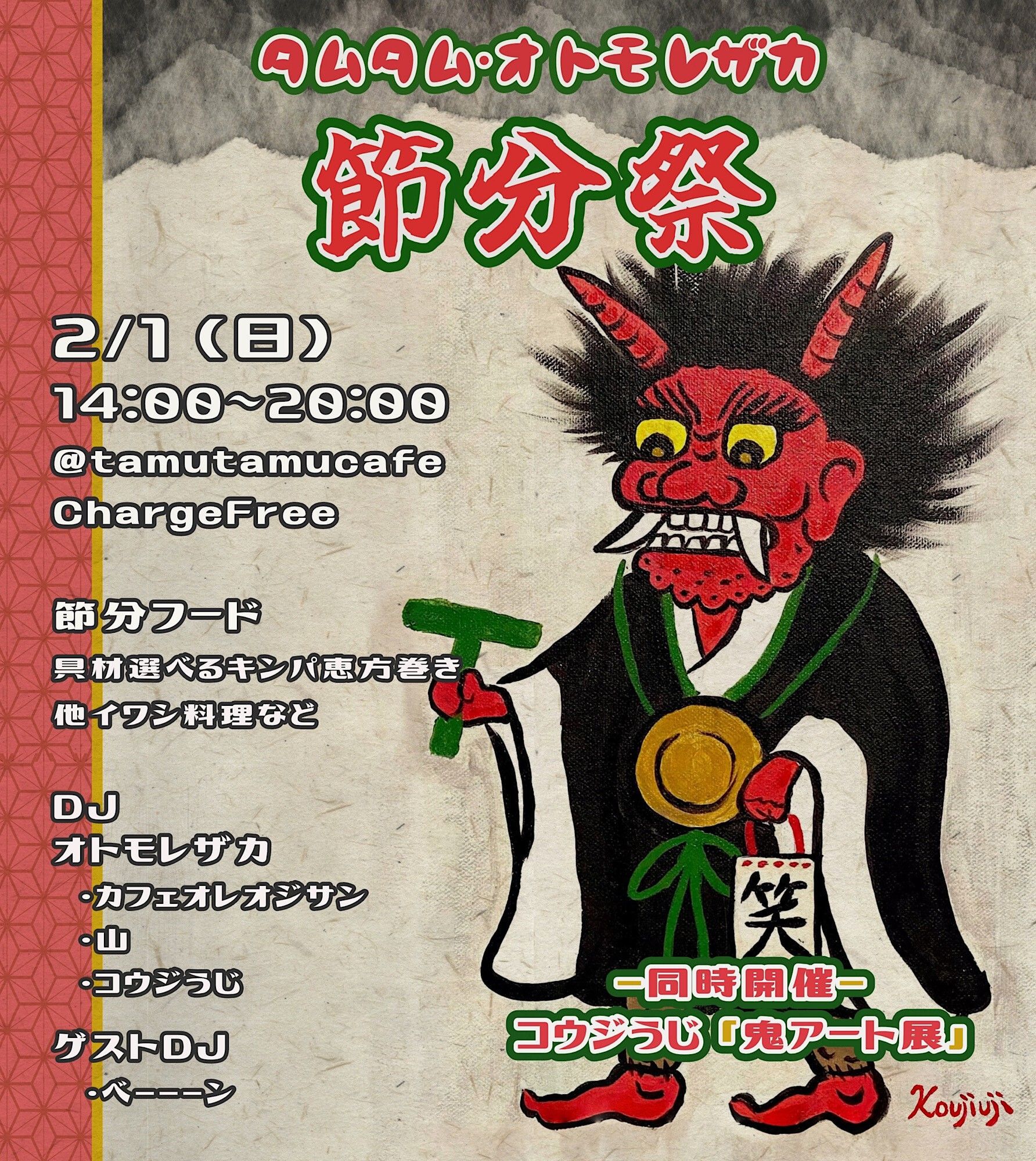 串カツ祭り、餃子祭りと続いた『タムタムオトモレザカ』ですが、2月1日日曜の節分祭では節分フードとして、具材選べるキンパ恵方巻きやイワシ料理などをご用意して開催決定!しかも14時〜20時の初のDayパーティーです。普段夜遊びは無理な方も是非!当日から鬼アーティストでDJのコウジうじ『鬼アート展』も2月23日月曜祝日まで同時開催。南南東に向かって食べて!!