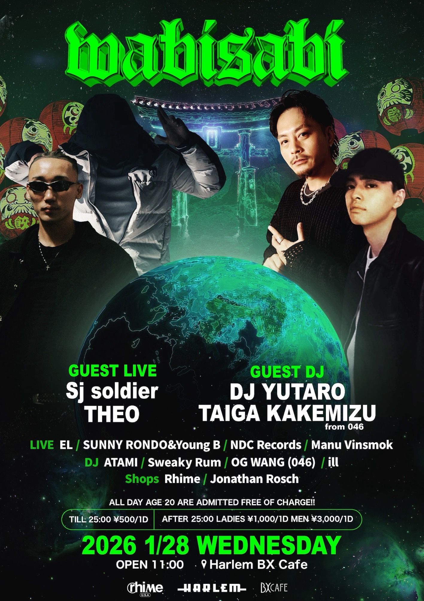 - LADIES ¥1,000/1d MEN ¥3,000/1d ※ TILL 25:00 ¥500/1d ※ AGE 20 ARE ADMITTED FREE OF CHARGE ALL DAY!!