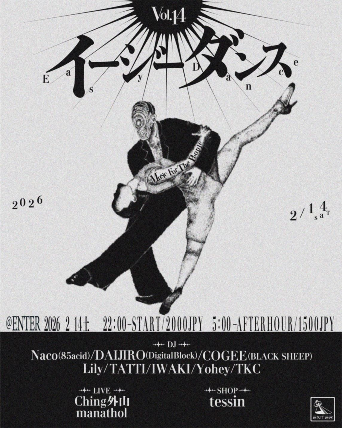 横須賀DJ BAR SHELLを拠点に、これまでに八王子SHeLTeR、渋谷EN-SOF、江ノ島OPPA-LA、青山蜂など、老舗ローカルクラブやDJ BARに神出鬼没してきた不定期開催パーティ イージーダンス 。 2024年10月に開催されたvol.11以来のENTER SHIBUYAでの開催、14回目となる2月14日に渋谷の地へと再び舞い戻る。