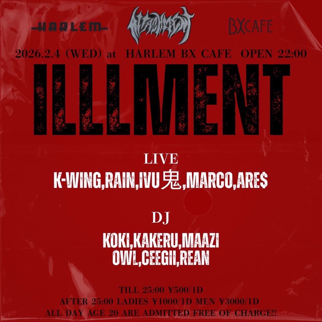 - LADIES ¥1,000/1d MEN ¥3,000/1d ※ TILL 25:00 ¥500/1d ※ AGE 20 ARE ADMITTED FREE OF CHARGE ALL DAY!!