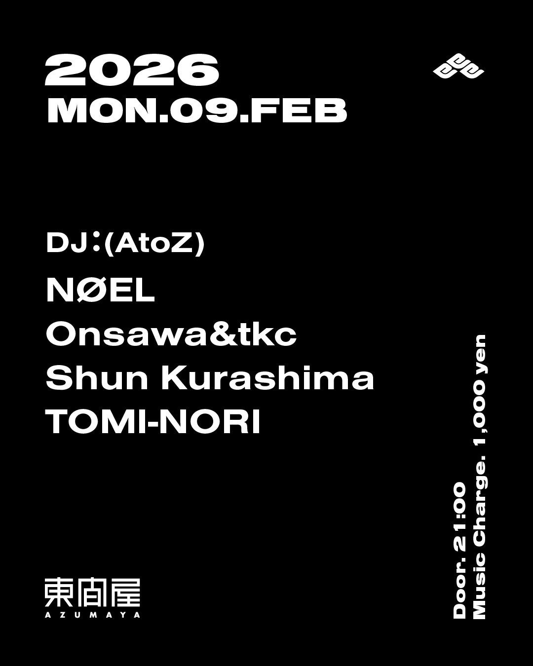 2026.02 09 FEB Azumaya -Monday- HOUSE TECHNO 0 Shares Facebook Twitter google Line DATE: 2026-02-09 MON OPEN: 21:00 VENUE: PRICE: Music Charge 1,000yen LINE UP: DJ:(AtoZ) NØEL Onsawa&tkc Shun Kurashima TOMI-NORI