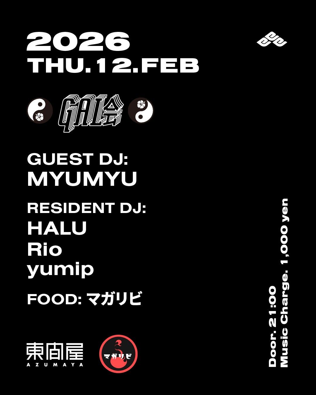 2026.02 12 FEB ギャル会 BASS MUSIC 0 Shares Facebook Twitter google Line DATE: 2026-02-12 THU OPEN: 21:00 VENUE: PRICE: Music Charge 1,000yen LINE UP: GUEST DJ: MYUMYU RESIDENT DJ: HALU Rio yumip FOOD: マガリビ