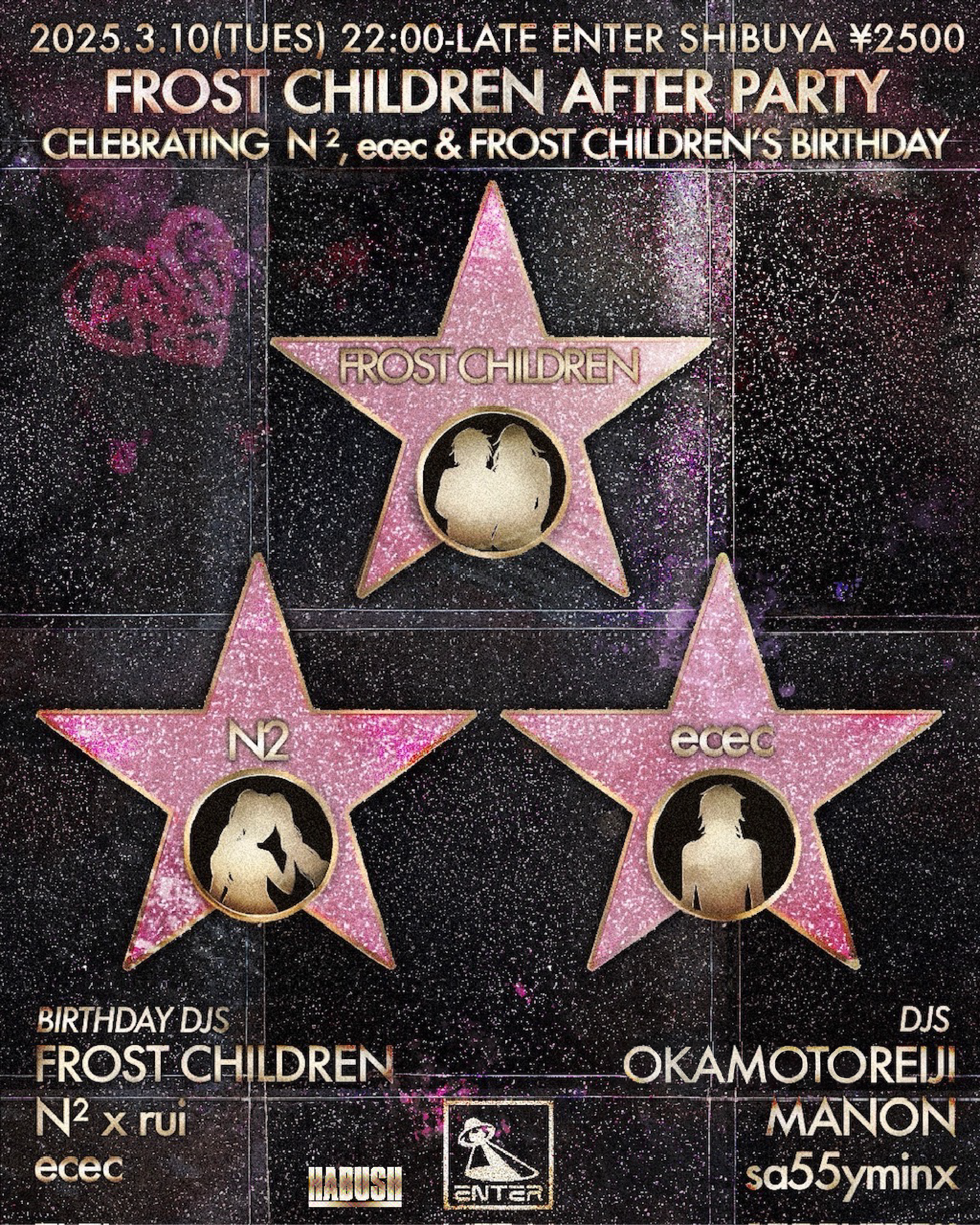 2026.03 10 MAR FROST CHILDREN after party + birthday celebration 4 N ² , ecec, angel & lulu ELECTRO TECHNO BREAKBEATS 0 Shares Facebook Twitter google Line DATE: 2026-03-10 TUE OPEN: 22:00 VENUE: PRICE: ¥2500 Door LINE UP: FROST CHILDREN (NYC) N ² x rui ecec OKAMOTOREIJI (OKAMOTO'S) MANON sa55yminx ニューヨークの兄妹の2人組Frost Childrenの日本初のワンマンライヴ(ソールドアウト)のアフターパーティを開催。ecec、N ² 、AngelとLuluの誕生日をお祝いしよう。 Open 22:00 ¥2500 Door ※本公演では20歳未満の方のご入場は一切お断りさせて頂きます。 年齢確認の為、ご入場の際に全ての方にIDチェックを実施しております。 写真付き身分証明証をお持ち下さい。