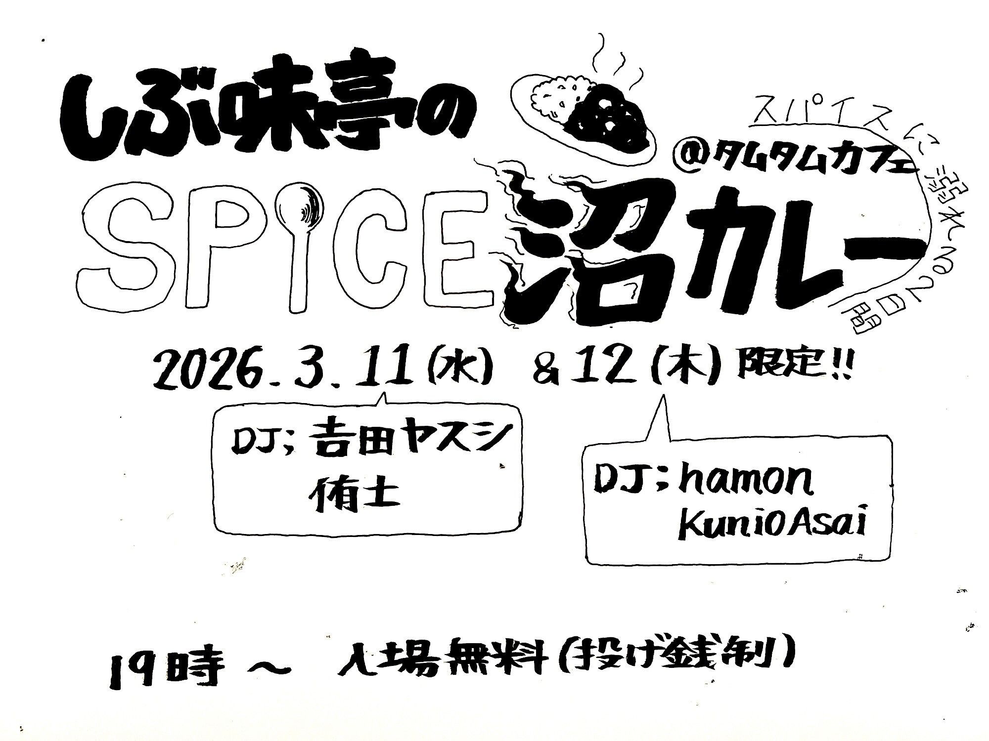 札幌PROVOやジョローナの楽園ポッアップでも大好評!シブミこと、しぶ味亭のスパイスカレーがタムタムカフェで2日間限定で食べられます♡DJも参加してもらって2日間パーティースタイルでやってますので是非!入場無料投げ銭制です。