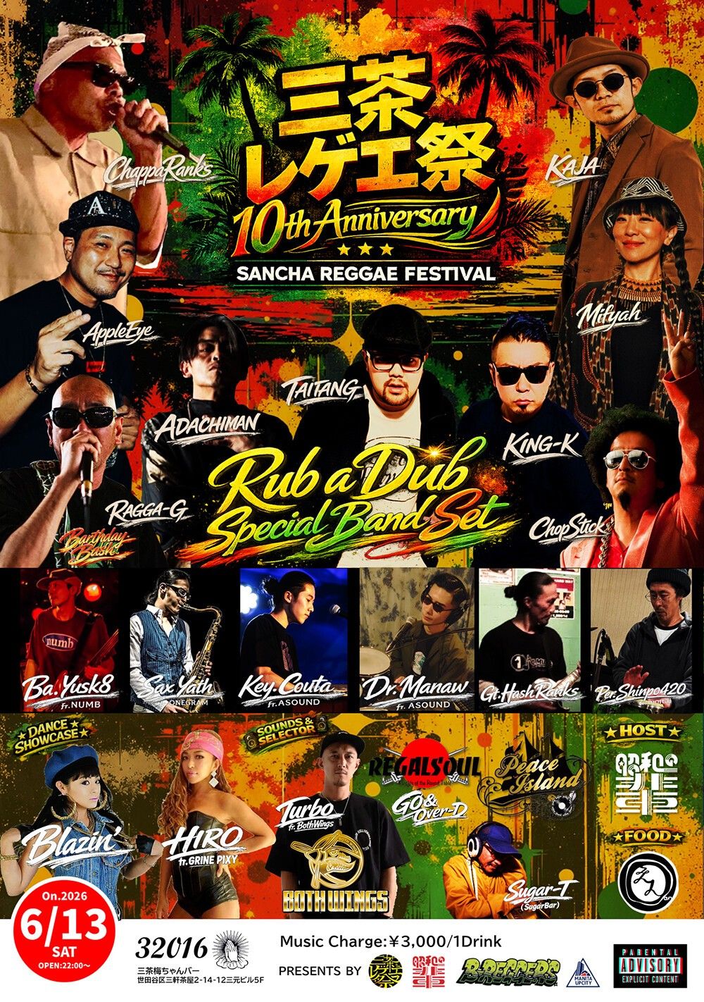 今年の三茶レゲエ祭は、10thAnniversary Special Versionとして、東京でも指折りの現場主義Deejayを招集し、“Rub a Dub Special Band Set” にてお届けします!