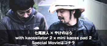KORG公式ホームページでは現在、シンガーソングライター七尾旅人とDJ/ラッパーやけのはらによるスペシャルコンテンツ「七尾旅人 x やけのはら with kaossilator 2 x mini kaoss pad 2」を公開中。2人による即興セッションの様子を収めたスペシャル・ムービーやインタビューを掲載しており、必見の内容となっている。 |