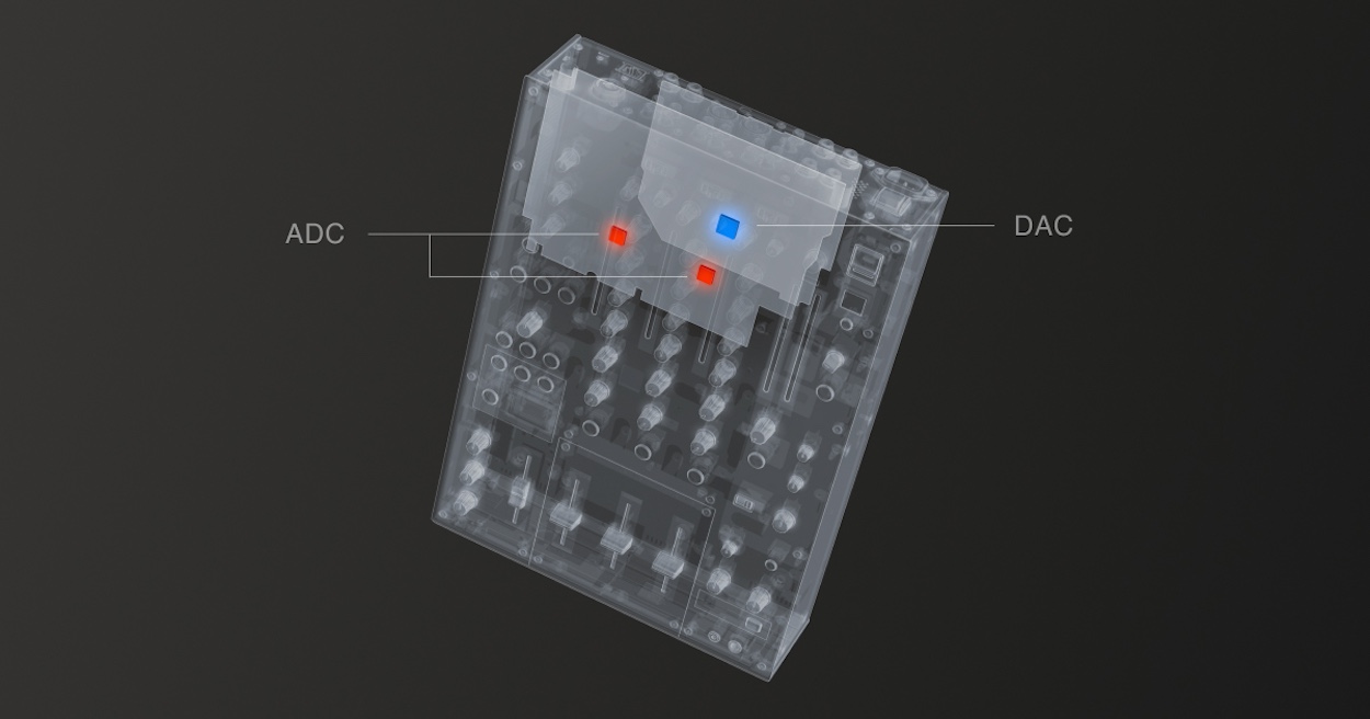 「DJM-V10」で好評を得た高解像度かつウォームな音質を継承し、複数の音源をミックスしても飽和を感じさせないバランスの取れたミキシングを実現。スタジオクオリティの96 kHz/ 64 bitミキシングDSP処理を採用し、チャンネル入力部とMASTER出力部にはESS Technology社製の32bit高音質A/D、D/Aコンバーターを搭載。